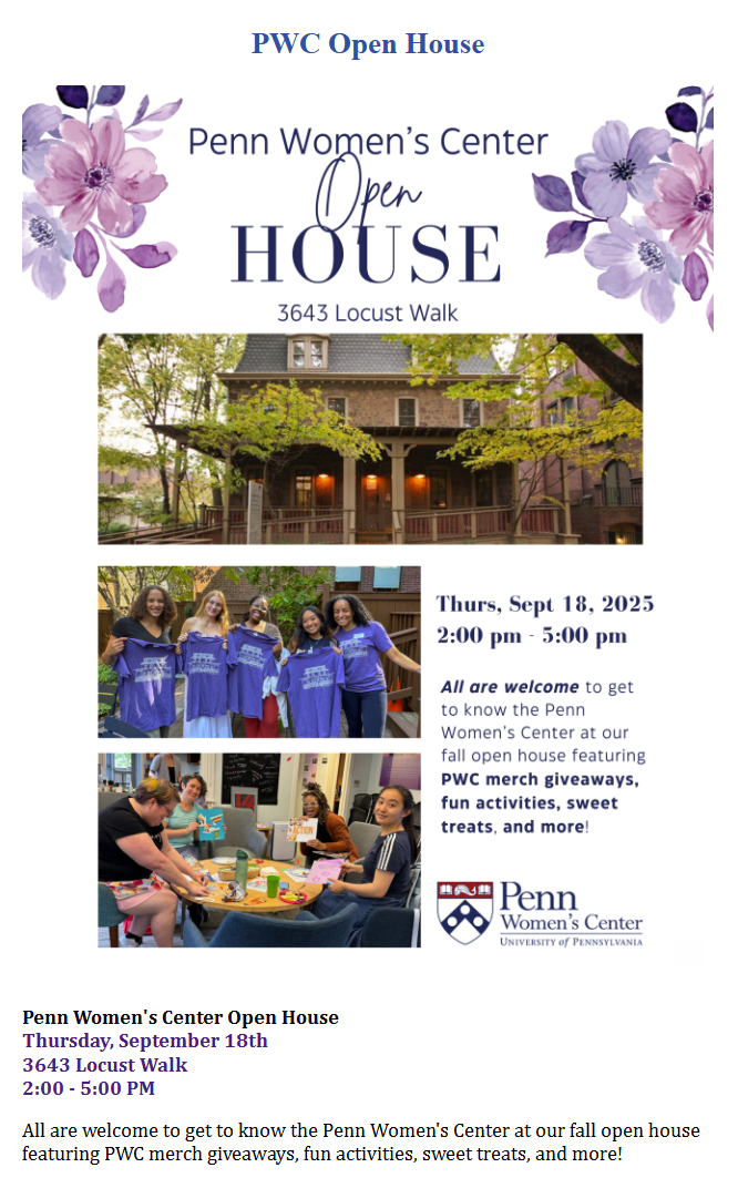 All are welcome to get to know the Penn Women’s Center (PWC) at Fall Open House featuring PWC merch giveaways, fun activities, sweet treats, and more!